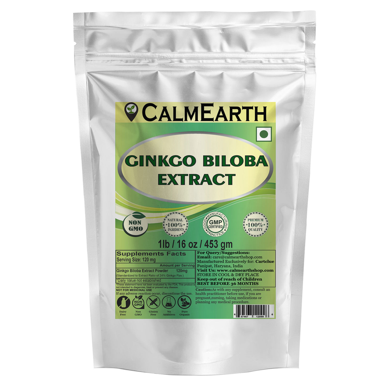 CalmEarth Ginkgo Biloba Leaf Extract Powder (24% Flavonoids, 6% Terpene Lactones) is a standardized botanical extract known to support cognitive function, circulation, and antioxidant protection. Manufactured in ISO & GMP certified facilities and independently third-party tested for quality.